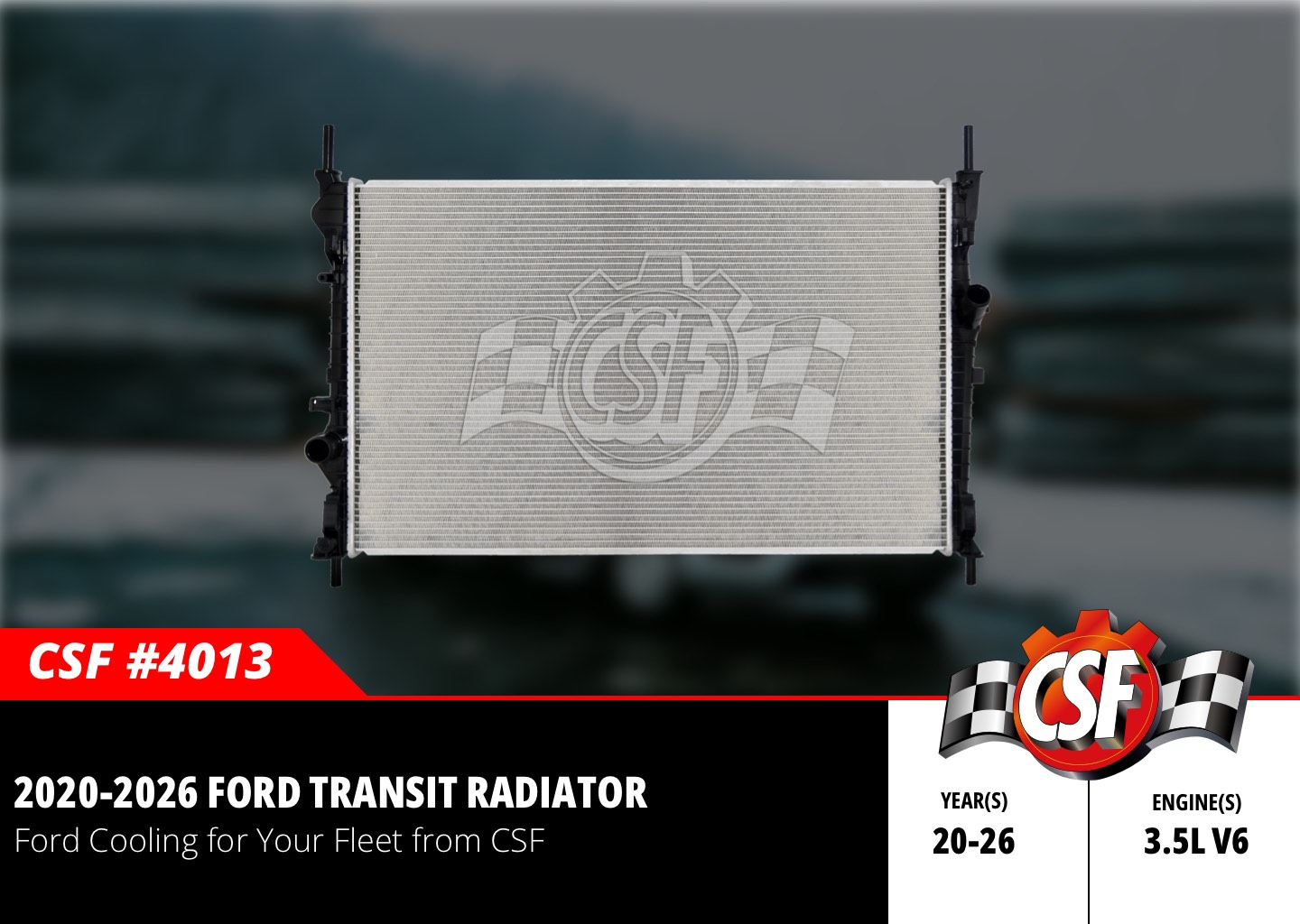 CSF is thrilled to announce the release of our new 2020–2026 Ford Transit radiator (CSF #4013). Built for the 3.5L V6 across the full Transit family (Transit, Transit-150, Transit-250, Transit-350, and Transit-350 HD), this radiator brings a meaningful core upgrade to one of North America’s most-worked commercial vans.